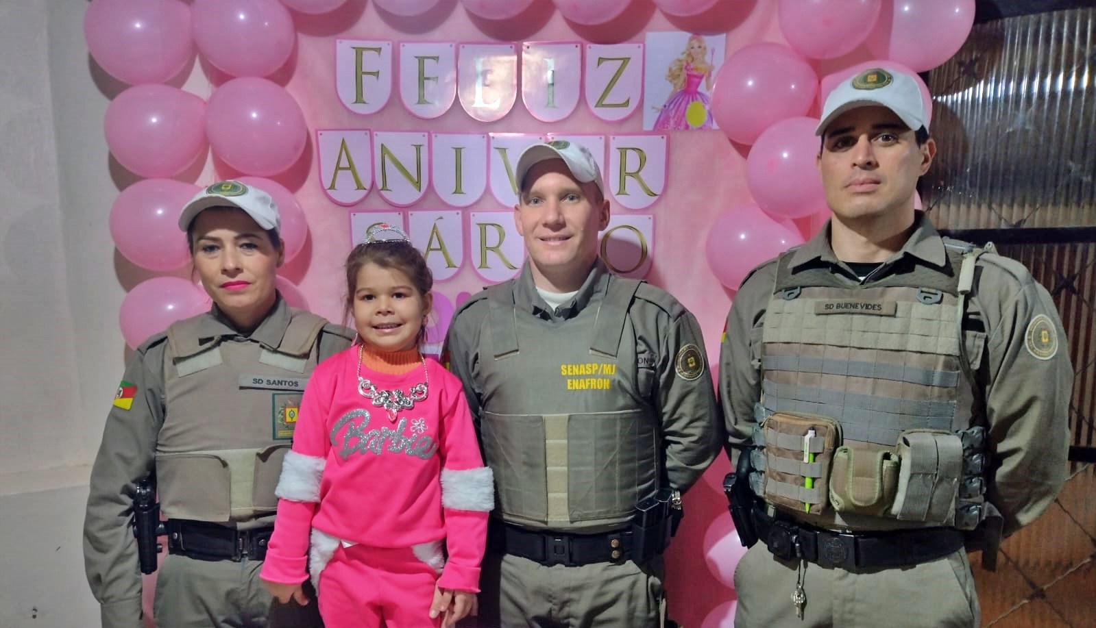 Policiais Militares que integram o 5º Regimento de Polícia Montada (5º RPMon), em Nova Esperança do Sul, prestigiaram o aniversário, de 5 anos, de Polyana Pereira de Matos, na noite desta quarta-feira (22), em sua residência. O pedido partiu dos pais da garota que admira a Brigada Militar e tem o sonho de se tornar uma policial militar.