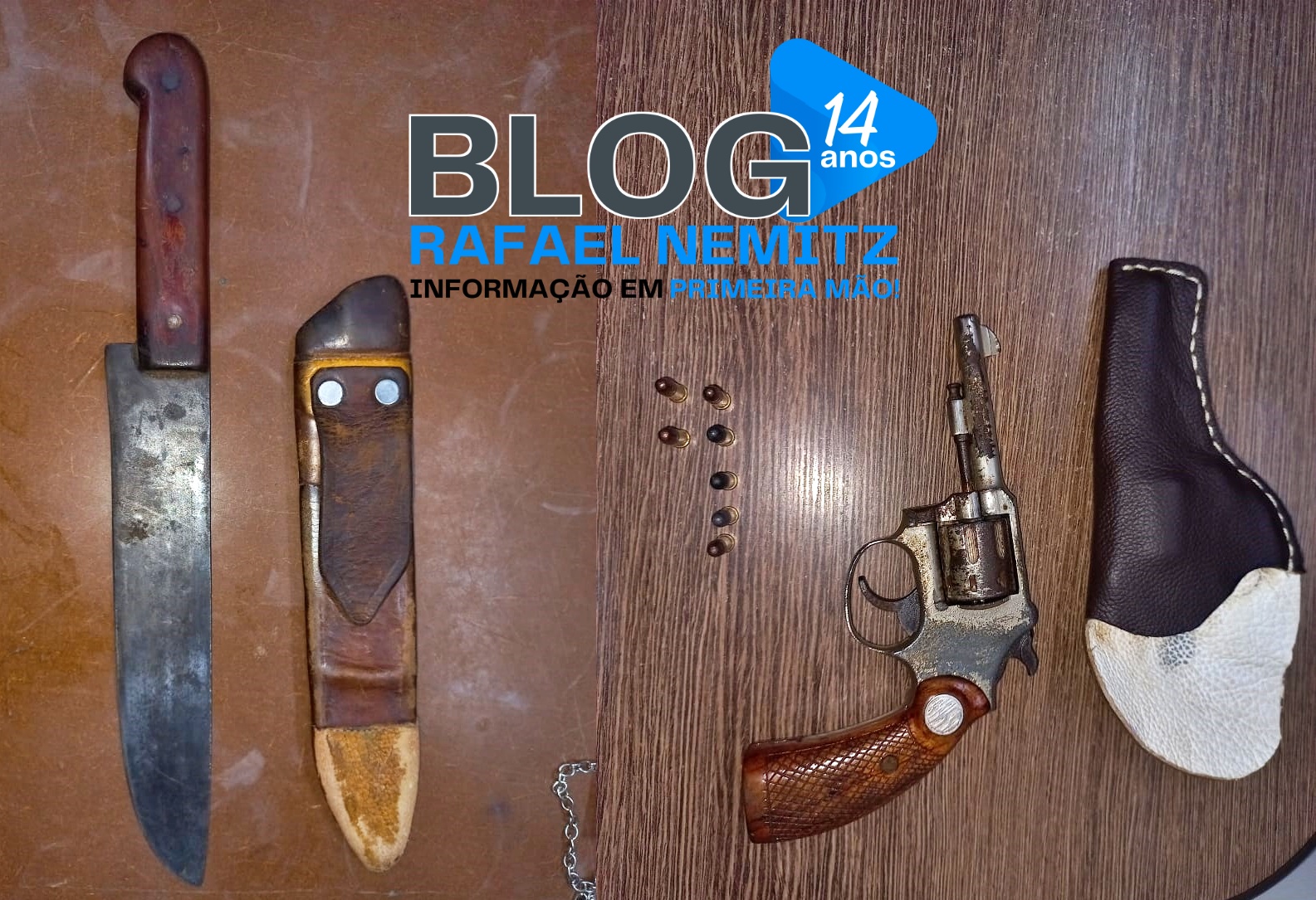 Na revista, além da faca que já havia sido apreendida, à BM encontrou um revólver Rossi, de calibre 32, com sete munições intactas.